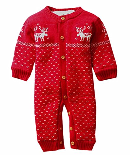 赤ちゃん 裏ボア ロンパース ニットカバーオール トナカイ柄 厚手 ベビー 可愛い 暖かい 出産お祝い クリスマス プレゼント (レッド, M)
