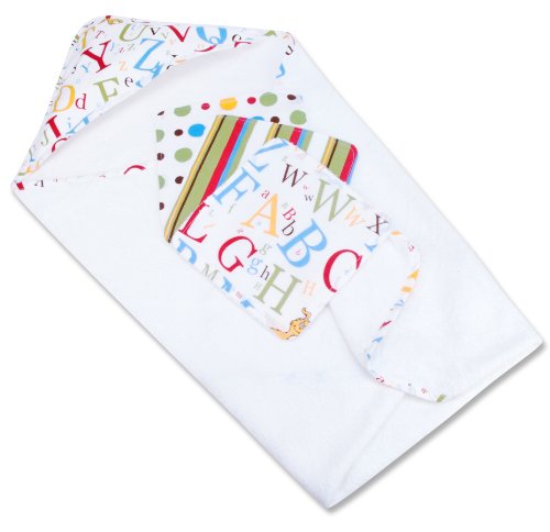 Contains 1 hooded towel and 3 wash cloths;Hooded towel measures 32 x 30;Wash cloths measure 8 x 8;Fun, modern prints on wash cloths;100% white cotton loop terry
