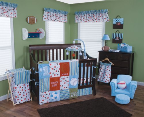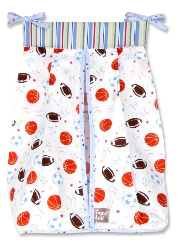 Diaper stacker body features a sports scatter print featuring footballs, basketballs, baseballs, and soccer balls;Made from 100% cotton and corrugated plastic in top and bottom insert;Hand wash;Measures 12 x 8 x 20.25;Holds up to 3 dozen diapers