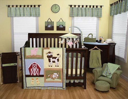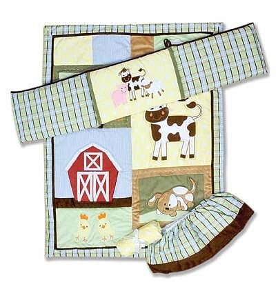 Baby Barnyard 4PC Crib Bedding Set From Decorators Furniture Market;Features a neutral color palette of brick red, avocado and sage green, chocolate brown, caramel, butter yellow, burnt orange, bubblegum pink sky blue and cream.;The quilt measures 35 x 45 and features soft embroidered baby animal and barn appliqu?s set against soft velour, ultrasuede and printed cotton;Fun-loving barnyard scene;An exquisite addition to your baby's bedroom!