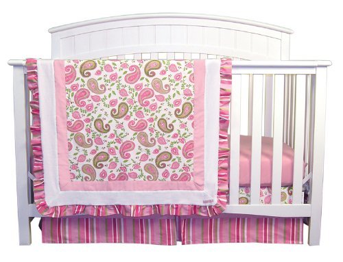 Paisley Park crib bedding is sweetly sophisticated and ultra-feminine! The paisley print in hot pink, bubblegum pink and fuchsia combined with sage and moss green is paired with a sweet multi-colored stripe, crisp white mini-waffle pique and soft pink ultra suede. This group's spin on traditional colors will bring a girly fashionable flair to your nursery!;Quilt: 35 in x 45 in;Sheet: fits a standard crib mattress;Skirt: 28 in x 52 in x 15 in