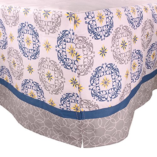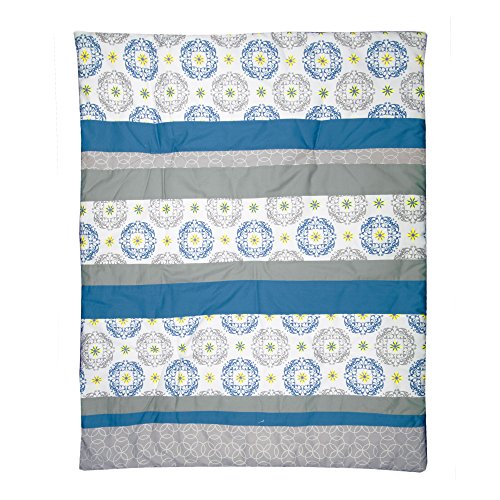 3 piece crib bedding set includes a reversible quilt, crib skirt and fitted sheet;Reversible quilt measures 35 inches x 45 inches; one side features patterned and solid sewn stripes in French blue, soft gray and crisp white with soft yellow accents, and the other is solid gray;Crib skirt has a 15 inch drop;Fitted sheet has 8 inch deep pockets and fits a standard size 28 inch x 52 inch crib mattress;100% cotton