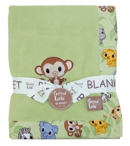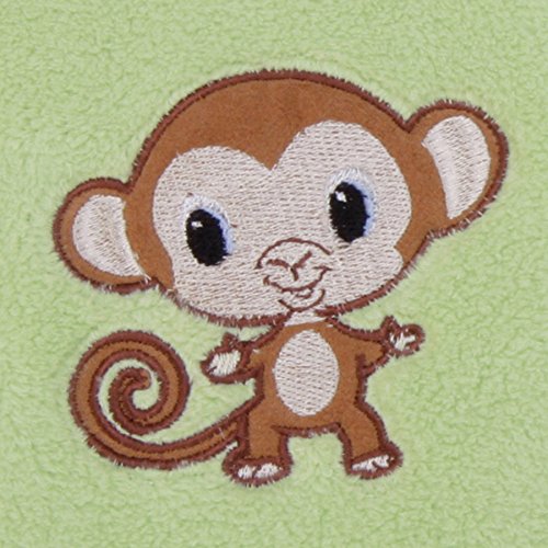 Framed coral fleece receiving blanket;body: 100% polyester; frame: 100% cotton;Machine washable;Measures 30 x 40;Monkey embroidery