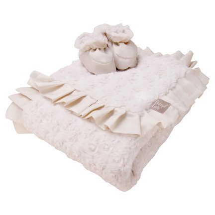 CREAM SWIRL VELOUR RUFFLE TRIMMED RECEIVING BLANKET AND REVERSIBLE BOOTIE LUXE GIFT SET - Blanket - Cream Swirl Velour With Cream Matte Satin Ruffle Trim; 30" x 40" Booties - Cream Swirl Velour With Cream Matte Satin Lining; Reversible; 4 1/4" x 2 1/2" x 2 3/4" by Trend Lab