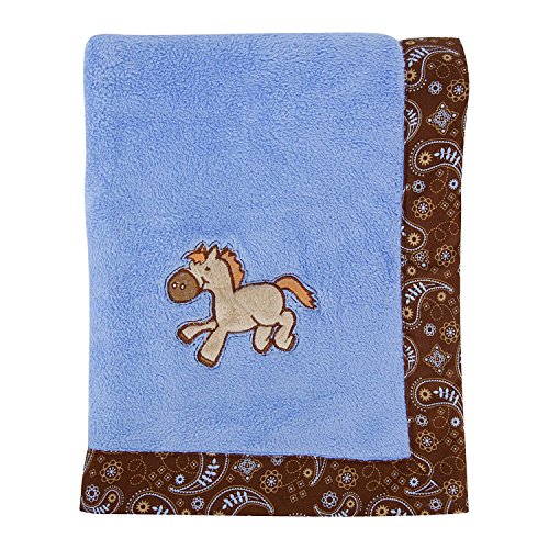Color:Blue Keep your little one warm and secure with this Cowboy Baby Framed Receiving Blanket by Trend Lab. Soft blue coral fleece is framed by a cotton percale bandana print in chocolate with powder blue and desert sand accents. A horse embroidered applique in the corner adds the finishing touch.