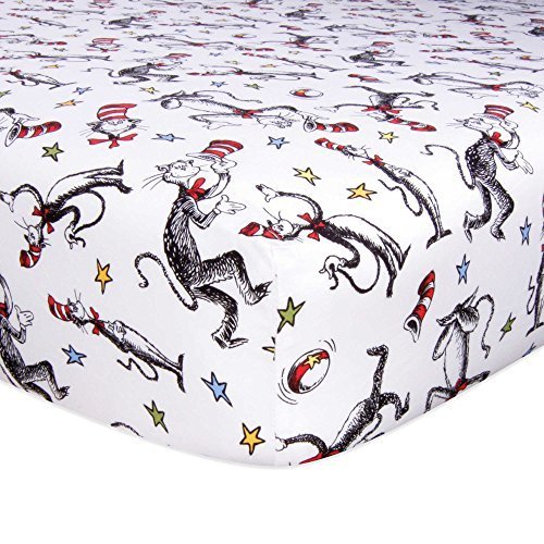 The Dr. Seuss Cat in the Hat Fitted Crib Sheet from Trend Lab features a fun scatter print of the beloved cat, brightly colored stars, and rolling balls;Sheet fits a standard crib mattress at 28 W x 52 L, with 10 deep pockets and elastic all around for a secure fit