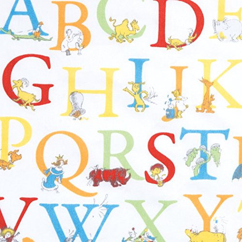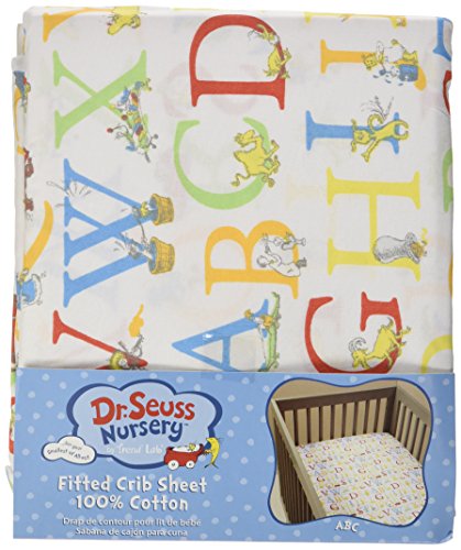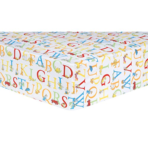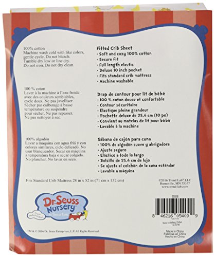 Dr.Seuss ABC Fitted Crib Sheet by Trend Lab is a soft 100% cotton percale featuring a whimsical motif print inspired by the classic Dr.Seuss ABC book! Colours of barn red, goldfinch yellow, sage green, cornflower blue and marigold orange bring cheer to any baby's nursery.Crib sheet fits a standard crib mattress at 70cm x 130cm .Deluxe 25cm deep pockets and full elastic trim ensure a secure fit.Please adhere to JPMA's Safe Infant Bedding Practises.Product sold under licence from Dr.Seuss Enterprises, L.P.
