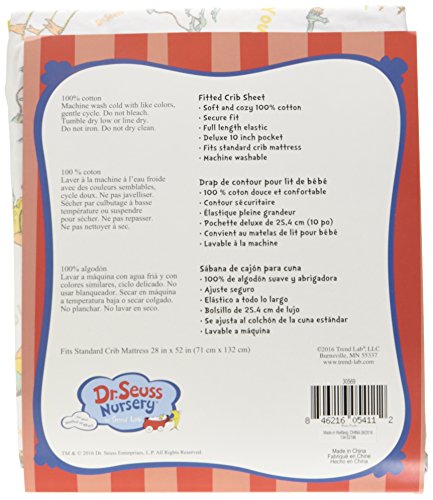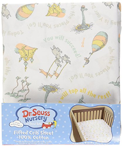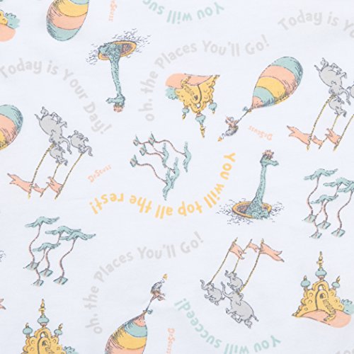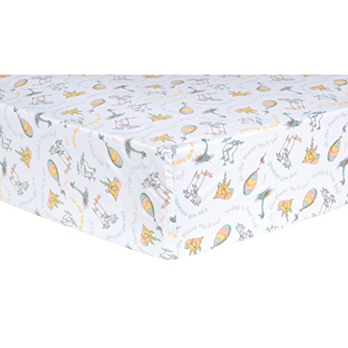 Dr.Seuss Oh, the Places You'll Go! Quotes Crib Sheet by Trend Lab is a soft 100% cotton percale featuring a whimsical print inspired by the quotes in the Dr.Seuss Oh, the Places You'll Go! book! Colours of mint, apricot, sunset yellow, and silver bring delight to any baby's nursery.Crib sheet fits a standard crib mattress at 70cm x 130cm .Deluxe 25cm deep pockets and full elastic trim ensure a secure fit.Please adhere to JPMA's Safe Infant Bedding Practises.Product sold under licence from Dr.Seuss Enterprises, L.P.