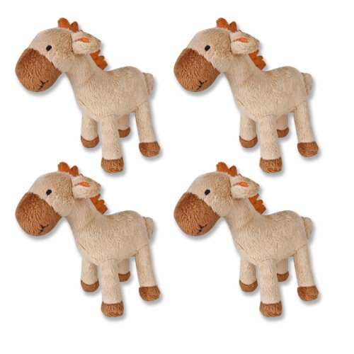 Mobile measures 18 tall by 20 wide;Four plush horses;Slowly rotate to Brahms Lullaby;Mobile easily attaches to most cribs;Encourage eye tracking and sound perception skills