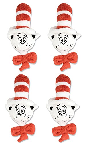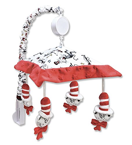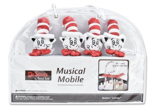 Encourage eye tracking and sound perception skills with the Dr. Seuss Cat in the Hat Musical Mobile by Trend Lab. Mobile canopy features a whimsical Cat in the Hat scatter print framed by star embossed red velour. Four plush mischievous Cats are suspended from decorative ribbon and slowly rotate to Brahms' Lullaby. Mobile easily attaches to most cribs. Mobile measures 18' tall by 20' wide. This mobile coordinates with the Dr. Seuss Cat in the Hat collection by Trend Lab.