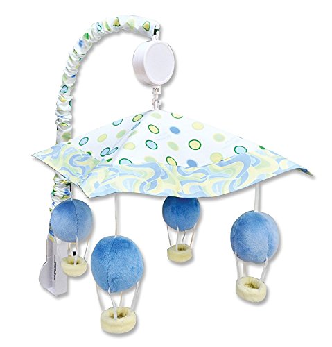 Encourage eye tracking and sound perception skills with the Dr. Seuss Oh the places you'll go Musical Mobile by Trend Lab. Mobile canopy features a charming pastel dot print framed by a fun swirl print. Four whimsical plush hot air balloons are suspended from decorative ribbon and slowly rotate to Brahms' Lullaby. Mobile easily attaches to most cribs. Mobile measures 18' tall by 20' wide. This mobile coordinates with the Dr. Seuss Oh the places you'll go Blue collection by Trend Lab.