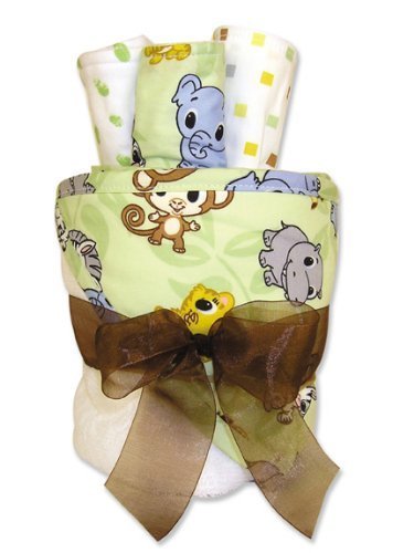 32 x 30" hooded towel rolled to resemble cake, 3 wash cloths each measuring 8 x 8" are rolled and make the cake topper, Hooded towel is chibi zoo animals on hood and trip, Wash cloths have fashion twill print on one side and white terry on the other, For decorative yet practical gift giving