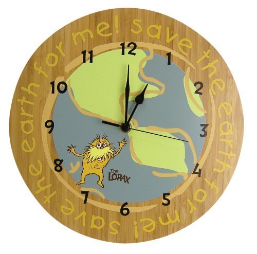 Complement any room with this stylish Dr. Seuss The Lorax Clock by Trend Lab. This natural circular clock features an earth scene with Dr. Seuss' The Lorax and Save the earth for me saying. Black numbers add the finishing touch. Mounting hardware is attached to the back for easy hanging. Runs on one AA battery (not included). Coordinates with Dr. Seuss' The Lorax collection by Trend Lab. Product sold under license from Dr. Seuss Enterprises, L.P.
