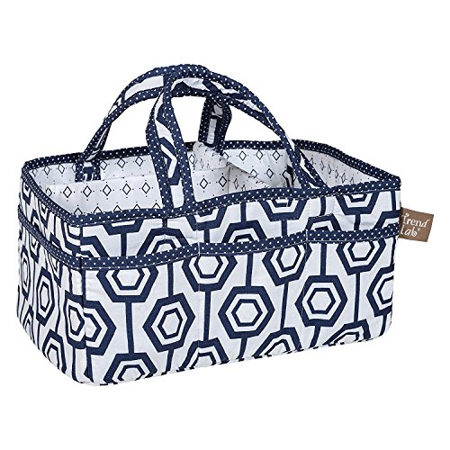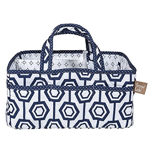 Add organization to any area of your home with this portable Hexagon Storage Caddy by Trend Lab. Perfect for dressers and changing stations, this lightly padded caddy has 8 outer pockets and a removable 'T' separator for maximum versatility. The body features navy blue and white hexagon tile print with diamond print lining and mini dot print trim and handles. Keep diapers, wipes and other necessities tidy while traveling from room to room. Caddy also functions as an organizer for crafts, picnics, pet supplies, etc. Measures 12 in x 6 in x 8 in. Coordinates with the Hexagon collection by Trend Lab.