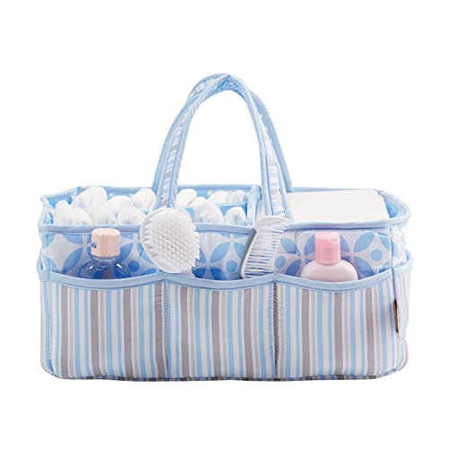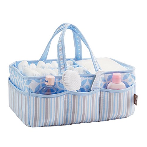 Color:Blue Add organization to any area of your home with this Logan portable Storage Caddy. This lightly padded caddy features a variegated stripe print in blue bell, shades of opal gray and white on the outside with a coordinating white and blue bell dot print on the inside and is finished with a blue bell and white circular lattice print trim. Caddy has 8 outer pockets and a removable ツ・ETツ・E separator for maximum versatility. Keep diapers, wipes and other necessities tidy while traveling from room to room. Caddy also functions as an organizer for crafts, picnics, pet supplies, etc.