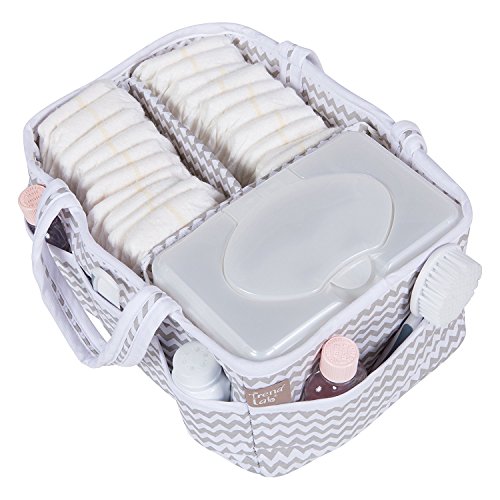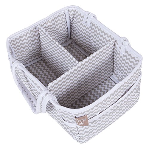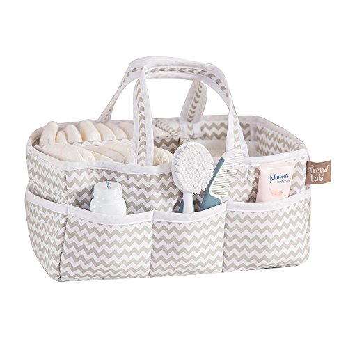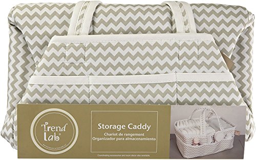 Add organization to any area of your home with this Dove Gray portable Storage Caddy by Trend Lab. This lightly padded caddy features dove gray and white chevron stripes with a crisp white trim. Caddy has 8 outer pockets and a removable 'T' separator for maximum versatility. Keep diapers, wipes and other necessities tidy while traveling from room to room. Caddy also functions as an organizer for crafts, picnics, pet supplies, etc. Measures 13 in x 9 in x 7 in. Coordinates with the Ombre Gray, Seashore Waves and Buttercup Zigzag collections by Trend Lab.