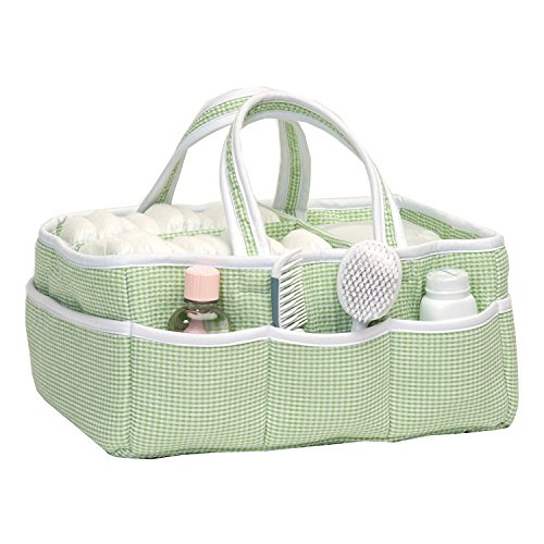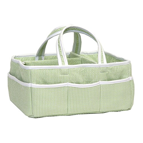 Add organization to any area of your home with this sage green Gingham Seersucker portable storage caddy by Trend Lab. This lightly padded caddy features a classic sage green and white gingham seersucker body and is finished with a white trim. Caddy has 8 outer pockets and a removable 'T' separator for maximum versatility. Keep diapers, wipes and other necessities tidy while traveling from room to room. Caddy also functions as an organizer for crafts, picnics, pet supplies, etc. Measures 13' x 9' x 7'.