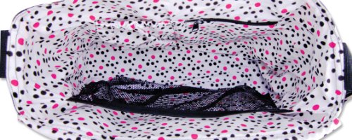 Bag measures 14 x 12 x 4;28 - 48 adjustable strap;Two interior pockets and large mesh divider;Two side bottle pockets and one wide velcro closure pocket on back;Removable, coordinating changing pad included