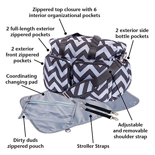 Features several organizational pockets;Removable stroller straps;Set includes a coordinating changing pad and a clear dirty duds zippered pouch