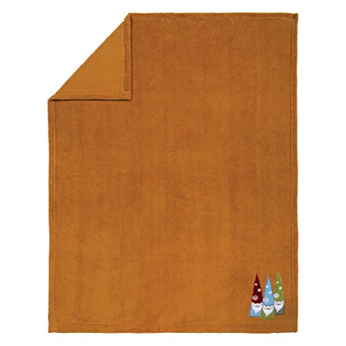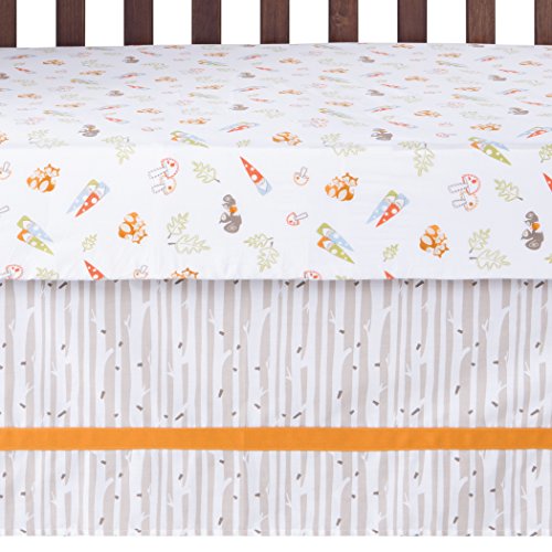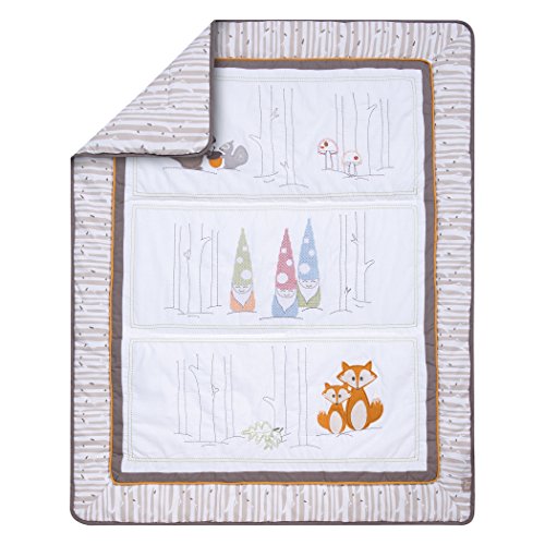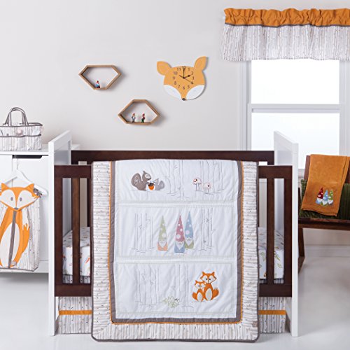 Gnome boy 4 piece crib bedding set - quilt, skirt, fitted crib sheet, baby blanket quilt-gnomes, forest animals applique, embroidery and cross stitch; birch print backing; solid bound edge; birch print borders; orange, blue, green and white; 35 in x 45 in crib skirt - birch print flat panel body; solid border; gray, white and orange; fits standard crib mattress 28 in x 52 in; 15 in drop fitted crib sheet - gnomes scatter print; green, brown, blue, red, white; fully elasticized; 8 in deep pockets; fits standard crib mattress 28 in x 52 in baby blanket - orange fleece; rolled hem frame; gnome applique; orange, blue, green, white; 30 in x 40 in.