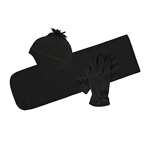 子供用フリース3点セット。セット内容:帽子、マフラー、手袋。ロゴ刺繍入り。