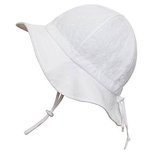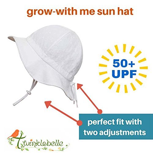 赤ちゃん用 50+ UPF 日光予防帽子 Sun hat、サイズの調整可能、チン・ストラップ付き(S: 0-9ヶ月, 白い刺繍)