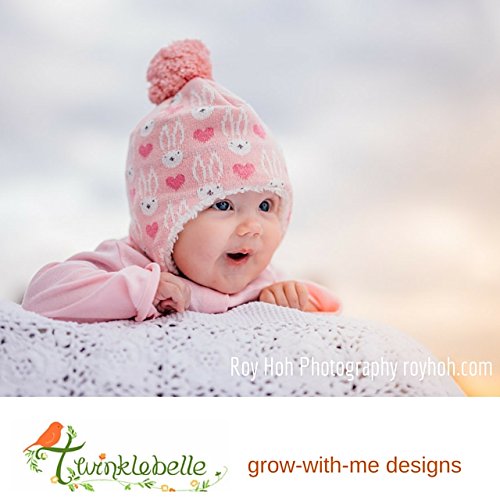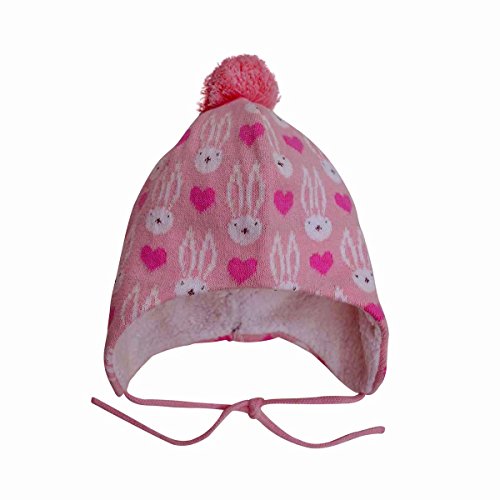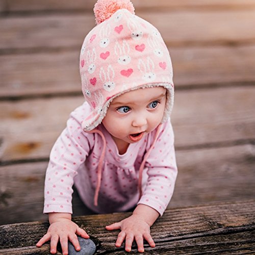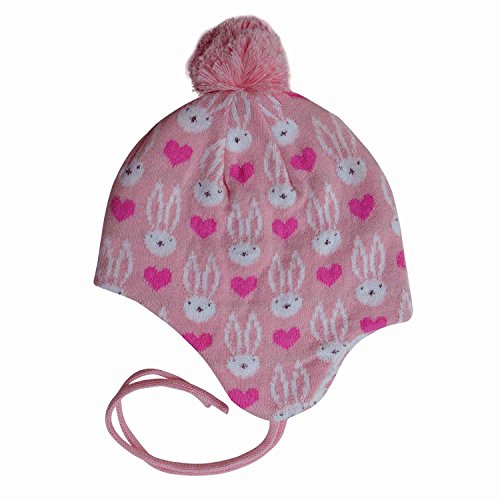 秋と冬用の心地よい赤ちゃん用のニットビーニー帽子。耳のフラップとチン・ストラップ付き (S: 3-9ヶ月, ピンク・バニー)