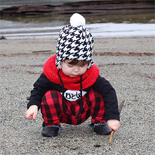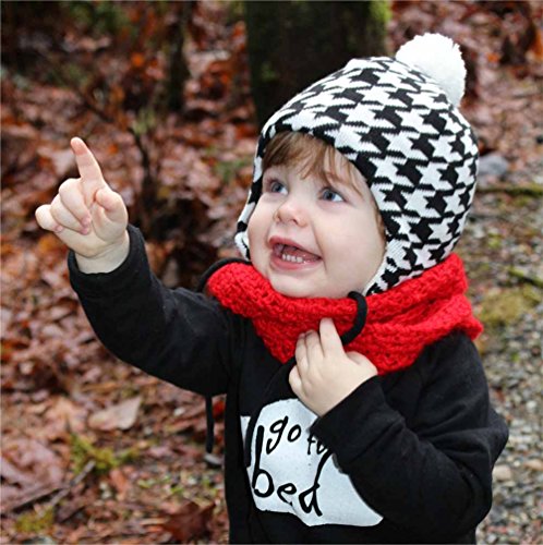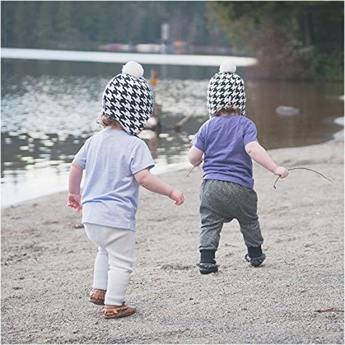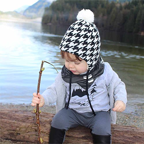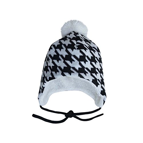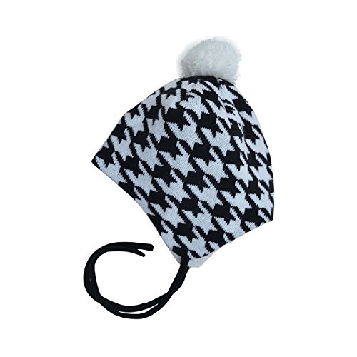 秋と冬用の心地よい赤ちゃん用のニットビーニー帽子。耳のフラップとチン・ストラップ付き (M: 6-24ヶ月, ハウンド・ツース)