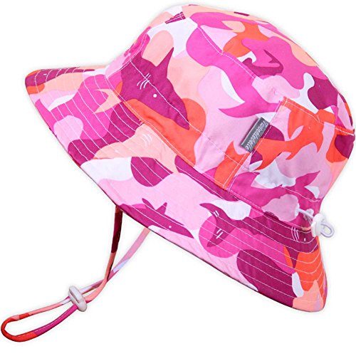 子供用50+ UPF日焼予防バケツ形帽子、 撥水加工、サイズ調整可能。顎紐付き (L: 3—12年, 撥水加工: ピンクの鮫)