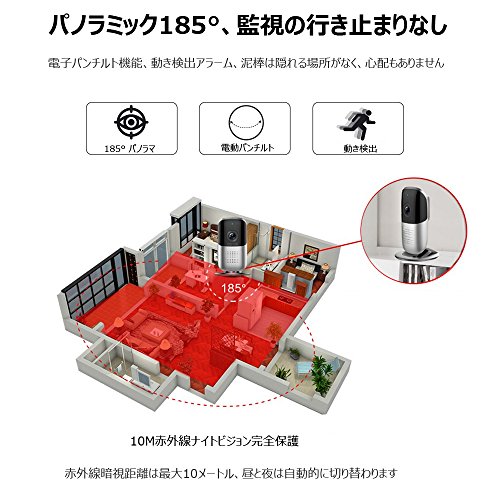 - 2ウェイのオーディオとアラーム:ipカメラにはマイクとスピーカーが内蔵されているので、携帯電話で家族や友人と話すことができます。カメラと話をするか、カメラを聞く。また、720pのHDカメラ、180度の広角レンズであなたの家の最大128GB . StreamリアルタイムビデオにマイクロSDカードへのビデオ録画をサポートしています。スマートフォンにスマートアラートを押して、動きが検出されたとき - 音と特定の時間。内蔵IR LEDを使用すると、暗闇でもライブ映像を最大25?30フィート(8m)