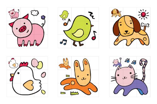- 6種類の絵「いぬ・ねこ・ぶた・ひよこ・にわとり・うさぎ」を組み合わせるパズルです