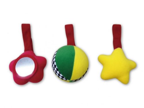 ベビーカーやベビーベッド等にぐるぐると巻きつけることができるおもちゃです。お花は鏡、ボールは鈴、星はにぎると音が鳴り、各パーツはマジックテープで取り外しが簡単です。