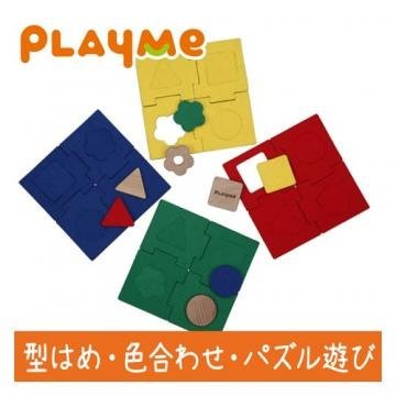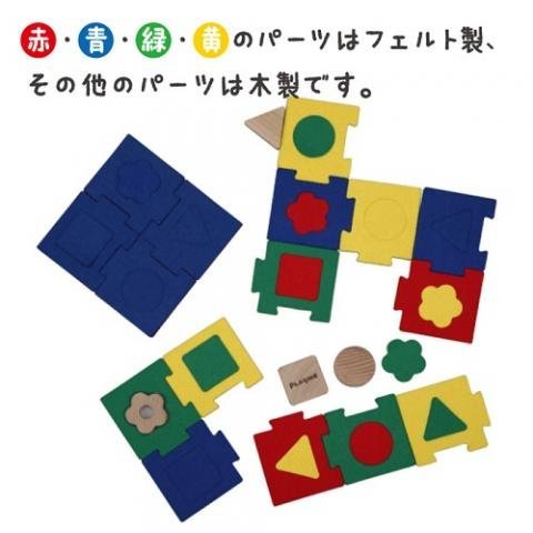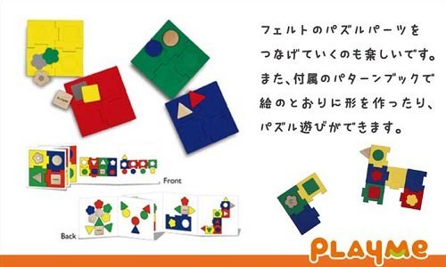型はめ、色合わせ、パズル遊び フェルトのパズルパーツをつなげていくのも楽しいです。 また、付属のパターンブックで、 絵のとおりに形を作ったり、パスル遊びができます。