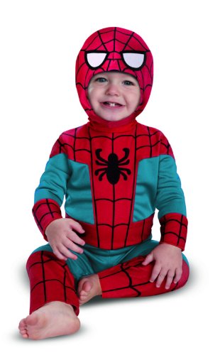 キュートなスパイダーマンの赤ちゃん用コスチューム♪スナップ開きのジャンプスーツに、やわらか素材のヘッドピース付きです。