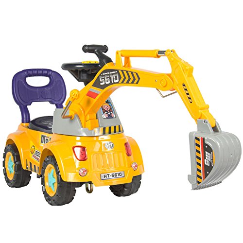 • Excavator is made out of durable material to withstand the weight of any toddler and contains a rotating driver’s cab • Any child can easily control the arm digger to dig through sand, dirt, or pebbles • Contains different buttons that make real sounds such as a horn, siren, and a button that plays 5 different tunes • Steering wheel and headlights flash as the music is being played • There is a hidden storage space underneath the seat in which a 3-piece gardening tool set is included to complete the set