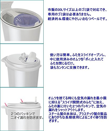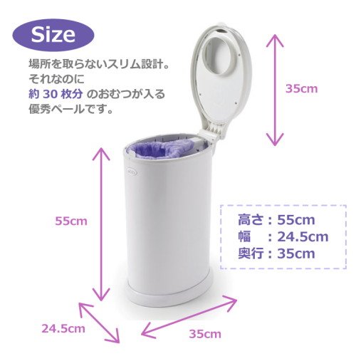 場所をとらないスリムでシンプルなデザイン。お部屋においてもニオイ漏れをシャットアウトしてママ安心!市販の30リットルサイズ以上のゴミ袋で対応できて経済的&環境にもやさしい設計です。