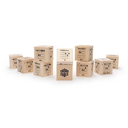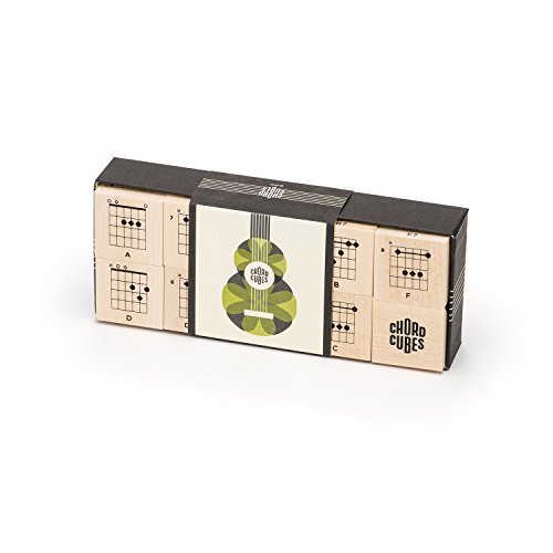 Roll up the tattered chord poster and delete the smart-phone app! Uncle Goose Chord Cubes for guitar gives you the basic chords you need to play all the hits while doubling as an interactive piece of eye candy for the coffee table. Nine cubes with 54 chord diagrams - Major, Minor, and Dominant 7th chords in open and barre configurations plus the associated sharps and flats. A v-tray block stand helps avoid painful neck strain by creating the optimal chord viewing angle while learning to play. 10 - 1.75 inch basswood blocks printed with non-toxic, lead-free, child safe inks. Uncle Goose blocks are 100% handcrafted in Grand Rapids, MI from fast-growing and sustainable Great Lakes grown basswood.