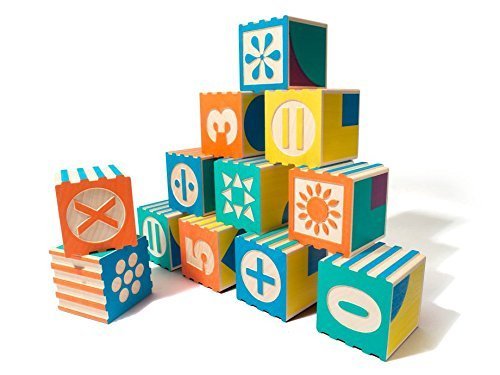 28 - 1.75 inch interlocking basswood blocks, contains numbers, symbols, shapes, and activity booklet, handmade in the USA, sustainable Michigan grown basswood, printed with non-toxic, lead-free child safe inks