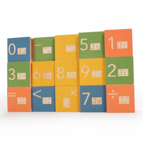 それぞれエンボスカラフルブロックでこの16点セットで3つの番号や数学記号が付いています。次に、使用されていたネーメト・クリスティアーン点字の数学の点字変換をエンボスする各番号の隣またはマークが追加されています。