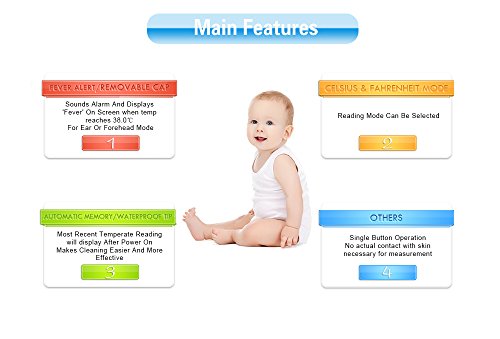 1秒以内に – インスタント読む – 簡単操作には使用できません。クリックするだけ測定、および読み取り – 音と視覚熱警告37.5 °Cを超える場合は、アラート/ 99.5 °F – 自動的にシャットダウンし、省電力機能 – CE、FDA承認