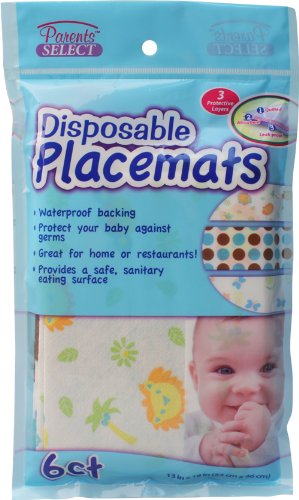 6 Disposable Placemats per package, 24 packages per case, for a total of 144.;Parents Select Disposable Placemats provide a clean eating surface anywhere your baby goes.;The large, 13 X 18 placemat protects your baby from germs which can be found on tables in public places.;When done, simply throw away. The re-sealable bag provides easy transport for use anytime, anywhere.