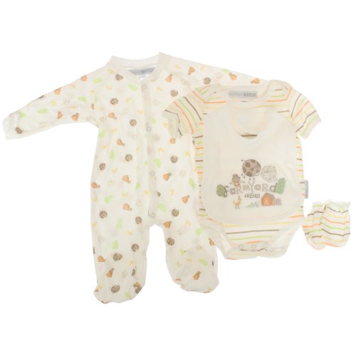 高品質4点ベビーギフトセット。ギフトにぴったり。セット内容:長袖ボディースーツ、半袖ボディースーツ、スタイ(よだれかけ)、ミトン。綿100%。洗濯機洗い可。