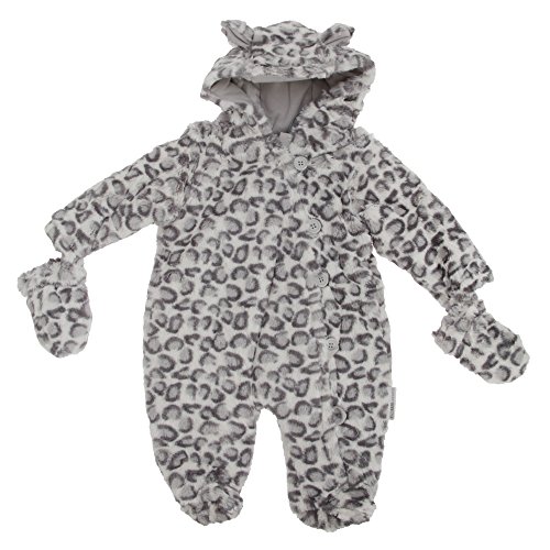 高品質ベビー用スノースーツ。フェークファー、ヒョウ柄のデザイン。フロントファスナー。ファスナーカバーはボタン(x5)留め。足の先までつながっているデザインです。ミトンはスナップボタンで取り外し可能。あったか、中綿入り素材。肌触りの柔らかい裏地を使用。フードにどうぶつの耳付き。ポリエステル100%。洗濯機洗い可。裏返して洗濯してください。