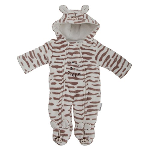 高品質ベビー用スノースーツ。タイガー柄のデザイン。フロントダブルファスナー。足の先までつながっているデザインです。あったかフリース素材。肌触りの柔らかい裏地を使用。フードにどうぶつの顔・耳付き。ポリエステル100%。40度以下で洗濯機洗い可。裏返して洗濯・アイロン掛けしてください。