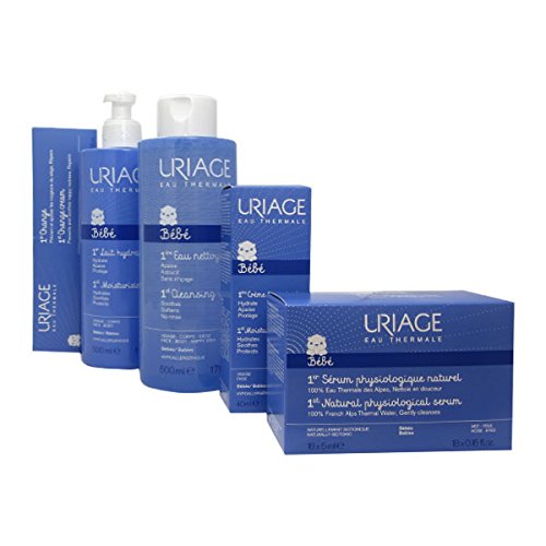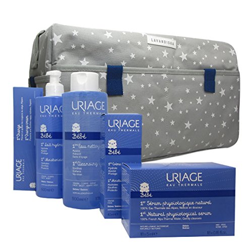 The Uriage maternity bag is composed of all the essential care in the first days of the baby. Face moisturizing cream 40ml + Body moisturizing milk 500ml + Cream barrier for diaper change 100ml + cleaning water 500ml + Ampoules of physiological serum 18x1