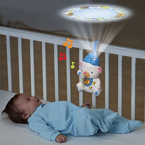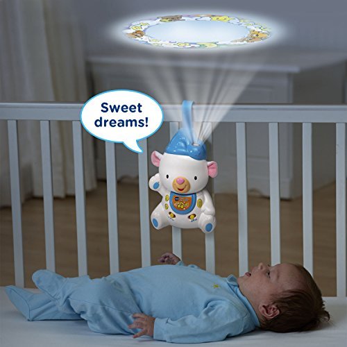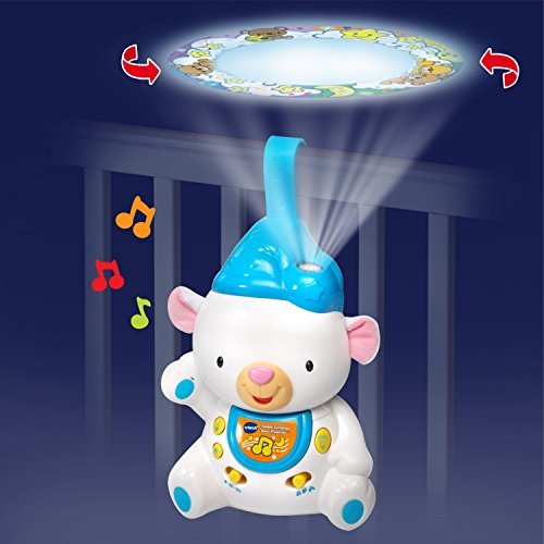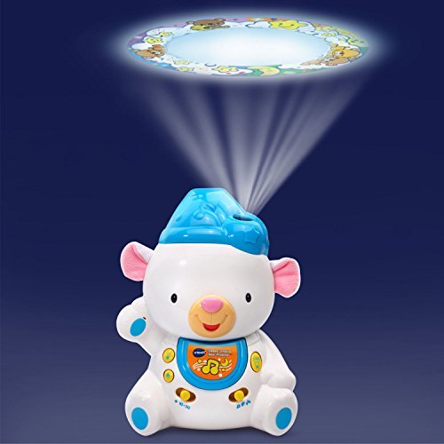Soothe your little one to sleep with the Sleepy Lullabies Bear Projector by VTech. This adorable bear projects a colorful image onto the ceiling to calm your baby. Choose between three sound modes that play music, nature sounds or white noise to help block out everyday noises so your baby can fall asleep faster. The bear also turns on and plays calming music when your baby cries and includes a timer switch that turns the bear off after ten or thirty minutes. Lull your baby to sleep with lights and lullabies! The crib projector is intended for babies from birth to 3 years. The crib light requires 3 AA batteries (batteries included for demo purposes only; new batteries recommended for regular use).