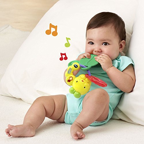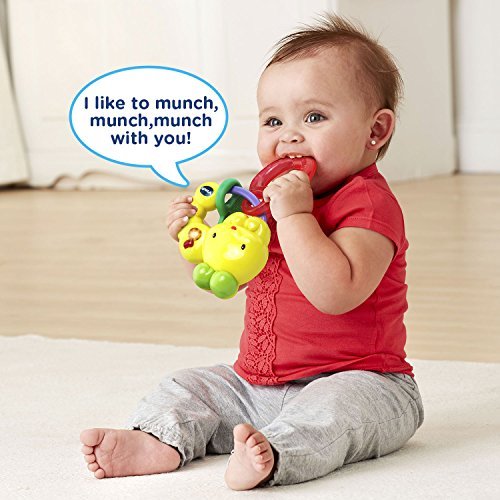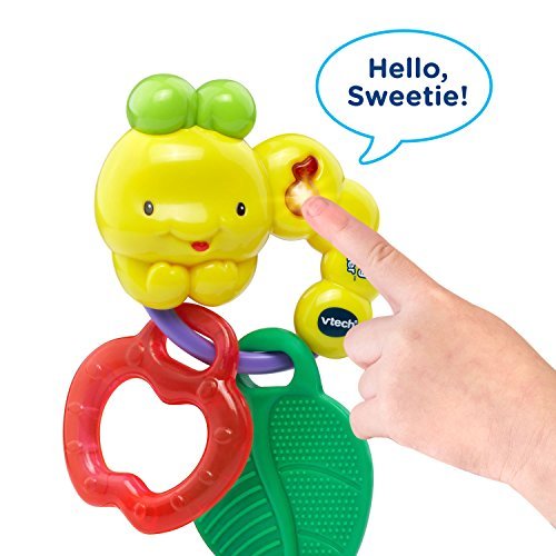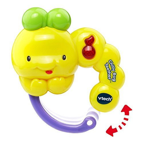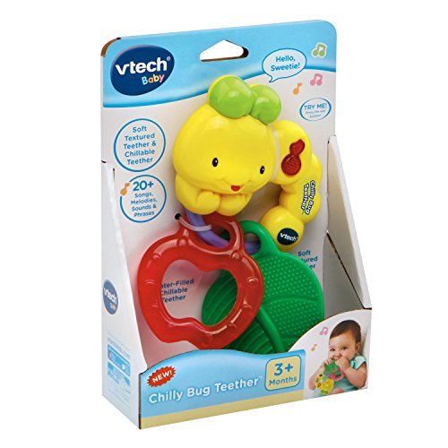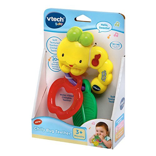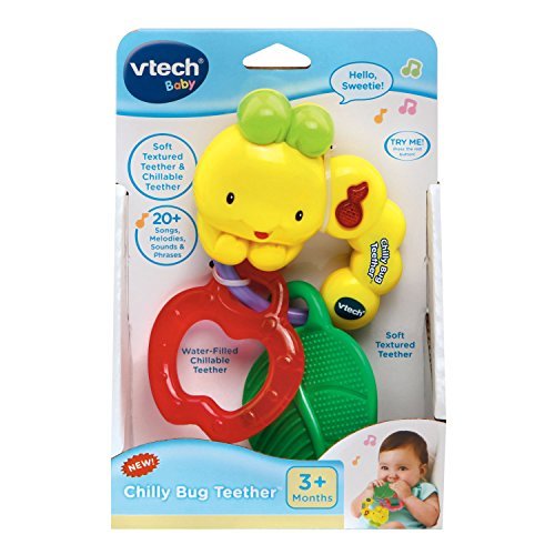 VTech baby teething toys are colorful and playful teethers. Teethe and listen to cheerful music with the Chilly Bug Teether by VTech. This adorable toy caterpillar features two types of teethers to soothe sore gums. One is a soft, textured leaf-shaped teether that massages your little one's gums. The other is an apple-shaped, water-filled chillable teether that cools and soothes. Both are easily removed for cleaning and sanitizing. Press the light-up music note button to activate playful songs, sounds, phrases and melodies. The caterpillar's ring design is also perfect for little hands to grab and hold. Munch and have fun with the cute caterpillar. The baby teether is intended for babies ages 3 months to 3 years. The musical teether requires 1 AAA battery (battery included for demo purposes only; new battery recommended for regular use).