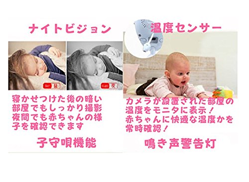 - 子守唄内蔵されており、ベビーモニターでの遠隔操作によって、ベビーカメラからとしてメロディを再生可能。家事が忙しくているママとパパは遠隔コントロールで赤ちゃんに落ち着かせる音楽が流せます。