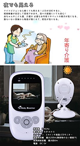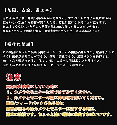- ネットの接続必要ない、Wi-Fiの使用必要もない、 電源を入れて、すぐにモニターから部屋の様子が見える。気軽に装置できる。通話ボタンを長押すと、赤ちゃんと通話できる