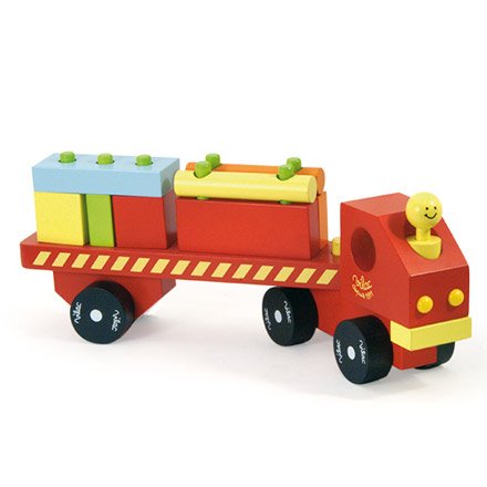 穴のあいた積み木を上手く並べてトラックを完成!運転手の頭を押すと、音が出ます。鮮やかな赤のトラックです。トラックであそぼう!